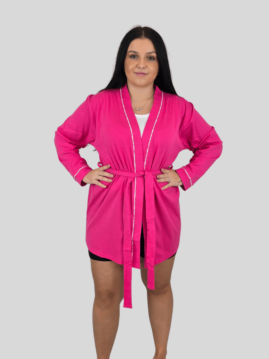 Tento dámsky župan je ideálny pre chvíle oddychu a pohodlia. Je vyrobený z mäkkého a príjemného bavlneného úpletu, ktorý je šetrný k pokožke a zároveň zaručuje priedušnosť. Župan sa v páse zaväzuje, čo umožňuje jednoduché prispôsobenie siluety. Župan je kratší, nad kolená. Tento župan je skvelou voľbou pre relax po kúpeli alebo na leňošenie doma.